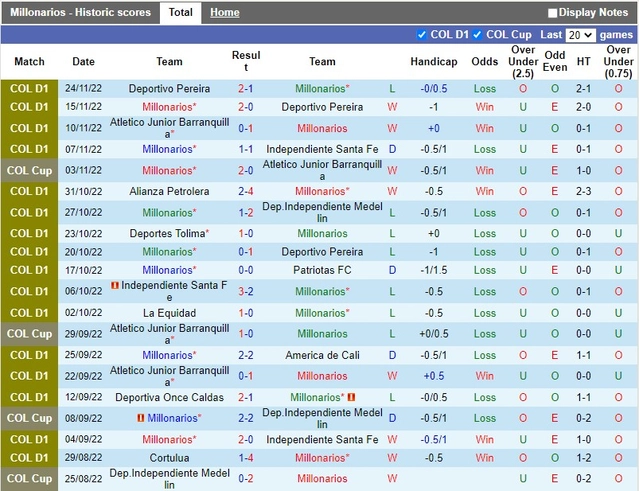 Kèo Tỷ Lệ Châu Á: Millonarios Chấp -0.5/1 FTKèo Tài Xỉu (O/U): 2.5/3 FT